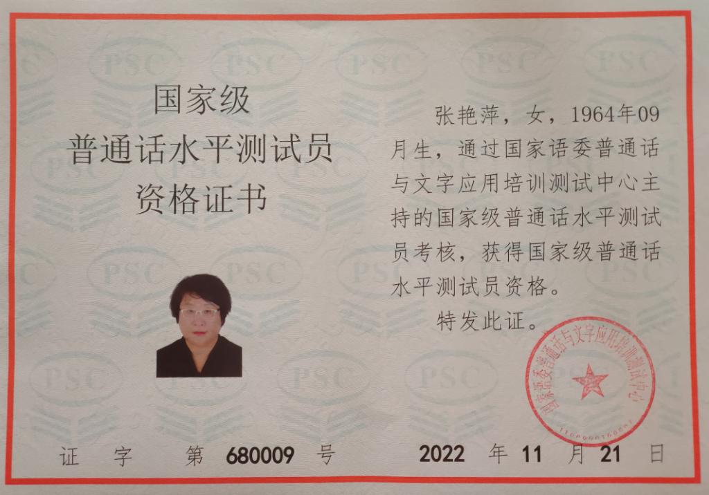 kaiyun开云官方网站张艳萍老师获得国家级普通话测试员资格证书 张艳萍老师是河北省普通话测试员,她不断进取,努力提高自己的普通话水平,积极参加普通话测试及推广活动。2022年经唐山市语委推荐,参加了国家语委组织的国家级普通话测试员培训。疫情期间,克服重重困难,完成了两期88学时的学习并通过严格考试,顺利通过了国家级普通话水平考试和国家级普通话测试员资格考试。因疫情原因,国家语委于今年暑假期间颁发证书。